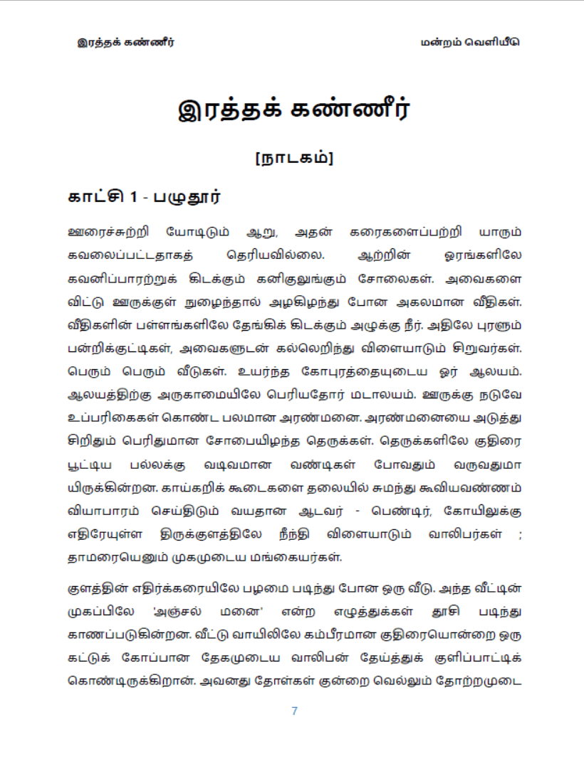 ஊரைச்சுற்றி யோடிடும் ஆறு, அதன் கரைகளைப்பற்றி யாரும் கவலைப்பட்டதாகத் தெரியவில்லை. ஆற்றின் ஓரங்களிலே கவனிப்பாரற்றுக் கிடக்கும் கனிகுலுங்கும் சோலைகள். அவைகளை விட்டு ஊருக்குள் நுழைந்தால் அழகிழந்து போன அகலமான வீதிகள். வீதிகளின் பள்ளங்களிலே தேங்கிக் கிடக்கும் அழுக்கு நீர். அதிலே புரளும் பன்றிக்குட்டிகள், அவைகளுடன் கல்லெறிந்து விளையாடும் சிறுவர்கள். பெரும் பெரும் வீடுகள். உயர்ந்த கோபுரத்தையுடைய ஓர் ஆலயம். ஆலயத்திற்கு அருகாமையிலே பெரியதோர் மடாலயம். ஊருக்கு நடுவே உப்பரிகைகள் கொண்ட பலமான அரண்மனை. அரண்மனையை அடுத்து சிறிதும் பெரிதுமான சோபையிழந்த தெருக்கள். தெருக்களிலே குதிரை பூட்டிய பல்லக்கு வடிவமான வண்டிகள் போவதும் வருவதுமா யிருக்கின்றன. காய்கறிக் கூடைகளை தலையில் சுமந்து கூவியவண்ணம் வியாபாரம் செய்திடும் வயதான ஆடவர் – பெண்டிர், கோயிலுக்கு எதிரேயுள்ள திருக்குளத்திலே நீந்தி விளையாடும் வாலிபர்கள் ; தாமரையெனும் முகமுடைய மங்கையர்கள்.